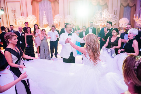 The ceremony was a romantic, lavish garden filled with opulence and splendor, guests were surrounded by decorative arrangements of white hydrangeas and garden roses. Down the center spanned a custom built white aisle lined with tapered candles lit in crystal candelabras. White Vogue chairs filled the room leading up to a Persian Sofreh table custom built in a circle design to symbolize endless love. A dreamy soft-lit pipe and drape was the background to a one-of-a-kind Sofreh set-up by the fabulous Details By Haleh. Orchids cascading with an assortment of roses and hydrangeas atop crystal vases, lined the aisle to create a dreamy atmosphere, as guests began to arrive and find their seats. The couples parents made their way down the aisle followed by the wedding party and then the stunning maids-of-honor, one by one, arriving at the head of the room on either side of the Sofreh. Guests all stood in admiration of the show-stopping couple as they entered the room. Arm-in-arm they floated down the aisle in a breathtaking display of poise and elegance. Once seated at the Sofreh, the traditional Persian ceremony began, with customary readings and blessings for the couple, including the sugar ceremony performed by the bridesmaids and the two mothers. Gifts were then presented to the couple from family and friends, as they posed for a picture before heading to the the foyer for cocktail hour.