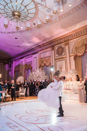 Two full white bloom trees accented either side of the opulent head table that sat perched on a custom built stage trimmed in rose gold. The head table was heavily draped in Phalaenopsis orchid and Quicksand Roses and filled with crystal candlesticks. On either side of the round white wrapped monogram dance floor, were custom made, high gloss white, half moon tables. Hanging above the tables on custom made fresh bloom covered trees, were 4 crystal hanging chandeliers. The floral designs included a waterfall of thousands of orchids over each centerpiece including hanging crystal pieces as well as 8ft waterfall Orchids, and the magnanimous floral arrangements framing the newlyweds. On each side of the Sweetheart table there were 13 foot tall white Blossom trees. Throughout the room were round tables with cream satin tablecloths topped with mirrors and white ceramic charges trimmed with gold. At each table set a mix of white chairs with rose gold trim and rose gold infinity chairs. The glow of the sea of candles reflected throughout, creating the perfect background for the glamorous, elegant and royal garden look. Next to the sweetheart table sat the cake, a towering 11 tiered design, 7ft high featuring delicate sugar ruffles, rose gold sugar pearls and a hand piped monogram. Rose gold spacers with a pearl trim added extra height. The couple enjoyed a vanilla cake with hazelnut buttercream, white chocolate coffee ganache and toasted hazelnuts, custom created by Anna Elizabeth.