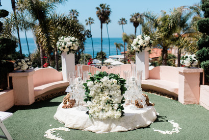 Set on the balcony overlooking lush foliage and the expanse of the ocean and sky, sat a perfectly placed round Sofreh Aghd, designed by none other than Details by Haleh. The bride and groom chairs placed in front of the magnificent spread of traditional Persian Ceremony items, that were symbolic and placed to represent elements of the couples new life and marriage together. The aisle, lined with rows of white chairs, was intricately decorated with white petals, and white pillars held lavish arrangements of white hydrangeas, spray roses and wax flower from Beautiful Savage Flowers.